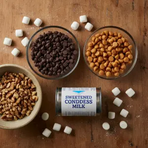 C’est le fudge « tout-en-un » légendaire : chocolat + butterscotch (ou brisures au caramel) + lait condensé Eagle Brand + guimauves + noix. Au Québec, on l’appelle souvent « fudge rocky road » même si y’a pas de nom officiel. La texture est folle : crémeuse du fudge, moelleuse des guimauves, croquante des noix pis caramélisée partout. Parfait pour les boîtes à biscuits ou les cadeaux gourmands.