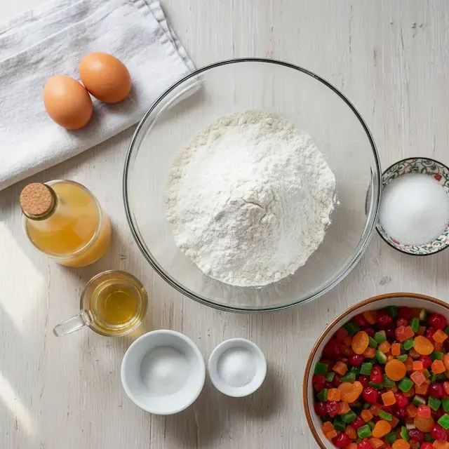 Verse liquides sur secs → remue juste assez pour humecter (quelques grumeaux = ok !). Ajoute fruits confits → plie délicatement.