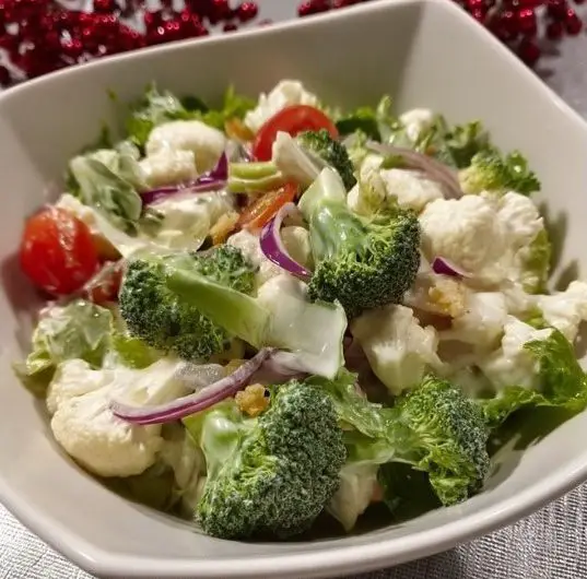 La Salade de Noël (aussi appelée salade de brocoli et chou-fleur) est LE plat d’accompagnement qui disparaît toujours en premier sur la table du réveillon. Des fleurons de brocoli et chou-fleur bien croquants, oignon rouge qui pique juste assez, tomates cerises juteuses et une vinaigrette crémeuse mayo-crème sure légèrement sucrée… c’est frais, c’est décadent, c’est 100 % Québec dans une assiette.