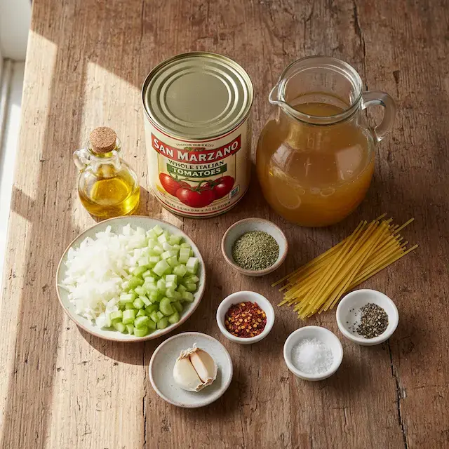 Voici quelques notes importantes sur les ingrédients. Pour les mesures exactes, voir la fiche recette plus bas. Huile d’olive : 1 c. à soupe – juste assez pour faire suer sans alourdir. Oignon et céleri : Petit oignon + 2 branches céleri – la base aromatique classique (soffritto). Ail : 1 gousse pressée – fraîche pour max parfum. Origan séché : 1 c. à thé – l’herbe italienne par excellence. Piment fort : Quelques flocons – facultatif mais divin pour un petit kick. Tomates italiennes entières : 1 conserve 796 ml – San Marzano si tu peux, sinon Plum du Costco. Bouillon de volaille : 5 tasses – maison ou en cube réduit en sodium. Vermicelles : 2 petites poignées – capellini cassés ou vermicelles fins – ils cuisent ultra-vite. Sel et poivre : Au goût – goûte toujours avant de servir.